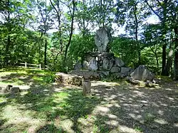 • 🌍 Seki no Magaibutsu (関の磨崖仏), Seki 67-1 Niisatocho (10-minute drive to north from Niisato Station of Jomo Dentetsu Railways). Designated a Prefectural Important Cultural Asset on November 15, 1972. There are three engravings on a boulder near the foot of the Fudo Bridge over Kaburaki River in the Seki district. This boulder was formed by the accumulation of ash from lava flows from eruptions on Mt. Akagi. The boulder is 128 cm in height, 60 cm in width and 80 cm in depth. The Amida Buddha in the center stands for eternal life; the Kannon Bodhisattva on the right stands for the spirit of salvation; and the Seshi Bodhisattva on the left stands for the spirit of asceticism. These carvings are believed to date from the Kamakura Era. The rock has been designated an Important Cultural Asset by the prefecture. OSM directions target=_blank