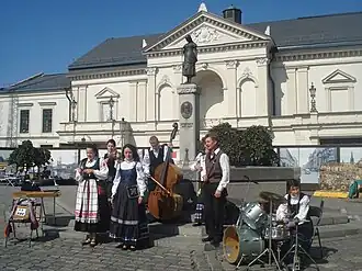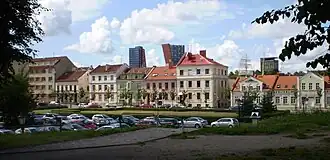 - 🌍 Theatre Square (Teatro aikštė). The cobbled plaza at the heart of Old Town. This district is on a grid pattern as it had to be rebuilt after an extensive fire in 1854: look for quirky little statues here and there. The larger statue in the square is "Ännchen von Tharau" (Anna Neander 1615–1689), whose marriage was commemorated in a uxorious poem by Simon Dach, later set to music.