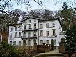 for which an artificial hill, called Springenberg, was raised. On the hilltop is an obelisk, on the hillside a decorative amphitheatre, and at its foot there is another park marked by a long body of water. The neighbouring 🌍 Forstgarten ("forest garden").