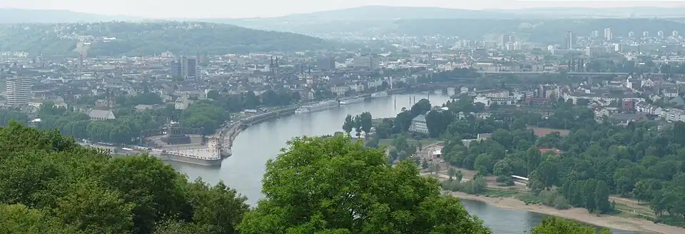 Koblenz is a city in the state of Rhineland-Palatinate in the Middle Rhine Valley in the Federal Republic of Germany. Koblenz has about 114,000 inhabitants (2019); the surrounding area accounts for about 400,000 people in total. The city is the northmost point of the Upper Middle Rhine Valley UNESCO World Heritage site.