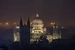 - 🌍 Victoria Memorial (ভিক্টোরিয়া মেমোরিয়াল Bhikṭoriẏā Memoriẏāl), Queen's Way (metro: Maidan 1 , Rabindra Sadan 1 , Victoria 3 ), ☏ +91 33 2223-5142, victomem@gmail.com. Tu-Su 5:30AM-6:45PM, Son et Lumière (English) 7:15PM Oct-Feb and 7:45PM Mar-Jun. Kolkata's most celebrated landmark, this monument was built with imperial self-confidence and was the brainchild of Lord Curzon, one of India's most flamboyant Viceroys. The domed structure was completed in 1921, with marble used from Makrana. Now a museum, the Victoria Memorial's 25 galleries are spread over 2 floors. The collection covers a fascinating selection of Raj memorabilia and includes the Calcutta Gallery with oil paintings and watercolours of the city's history. Do not miss the grand Durbar Hall, inside which lies a statue of Lord Cornwallis. The museum is set in extensive and beautiful lawns and is lit up at night. A laser audio-visual show is held on the lawns every evening. "Nike", the Greek Goddess of victory, on top of the museum, is said to be haunted and has been prominently featured in many Kolkata stories and novels. For garden; ₹4 for Indian; for museum ₹10 for Indian and ₹150 for foreigner. Camera free. The fees for light and sound shows are ₹10 and ₹20.