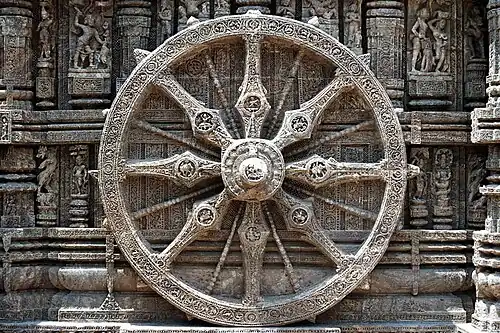 - The wheels of the chariot are also symbolic and have been interpreted as the 'Wheel of Life'. They portray the cycle of creation, preservation and achievement of realisation. The diameter of each of the wheels is about 9 feet (2.73 metres) and each of them has a set eight equal parts. They are elaborately carved all over. The thicker ones are all carved with circular medallions at their centres on the widest part of the face. The axels of the wheels project by about one foot from the surface, having similar decorations at their ends. The rims are carved with designs of foliages with various birds and animals, whereas the medallions in the spokes are carved with the figures of women in various luxurious poses, mostly of erotic nature.