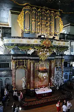 - 🌍 Kongsberg Church (Kongsberg kirke), Kirketorget 1, ☏ +47 32 86 60 30. Kongsberg's large church, one of Norway's largest, is a legacy from Kongsberg's important past. It was designed for 2400 seats, now seating is limited to 1100. The somewhat strict exterior conceals a rich rococco interior, the interior also reflects the particular mining society at Kongsberg. German professionals at the mines had a key impact on the design. The interior has several unusual features, such as the integration of the pulpit with the altar, the organ towering above. The largest chandelier is about 3 meters tall. The King's chambre is also a dominant feature of the interior.