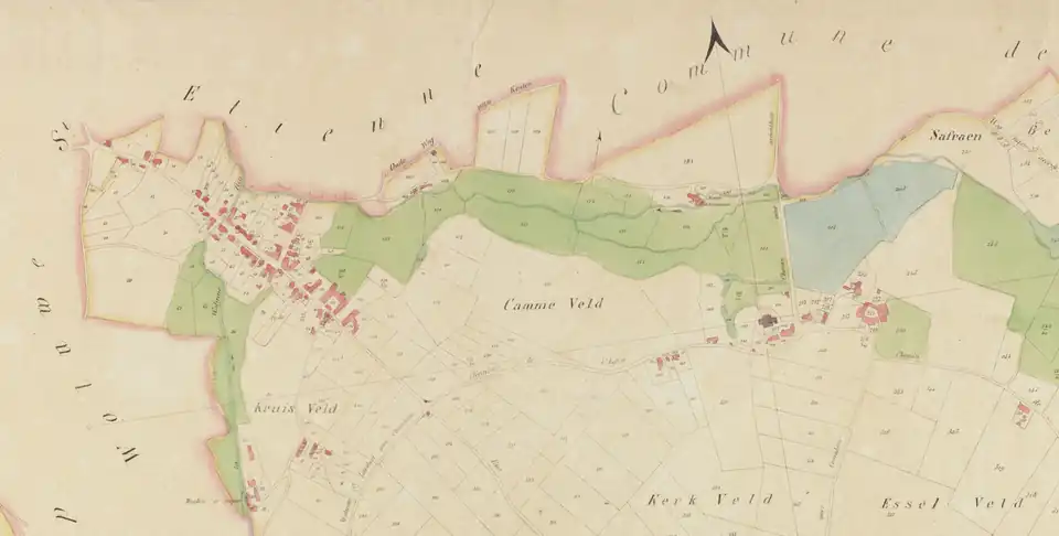 Most of Kraainems current territory remained uninhabited throughout the first millenium. The northern urbanised area of Kraainem, High Kraainem, evolved from a Frankish court centered around what is now known as the Jourdain Castle. It was little more than a fortification surrounded by a few dwellings in the first half of the 9th century. A map from 1771 shows the historic division of Kraainem between a high and low area: to the west a church built upon earlier fortifications, and to the east numerous farm houses and a few smaller dwellings. It is unknown how the fortifications might have looked, but remains of a double octagonal moat can be traced to the west of the church and remained prominent until 1836. The development of High Kraainem remained limited to this core until well into the 19th century, with a survey in 1830 counting only 15 houses.