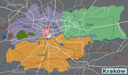 Kraków consists of 18 districts. The historic Old City is situated in District I Stare Miasto. Even though the words Stare Miasto mean 'old town', it should not be confused with the historic old town of Kraków itself, as the medieval old town is only a small central part of District I Stare Miasto. Some of the communities around the edge of Kraków can show you real Polish life away from the tourist-focused economy of the centre.