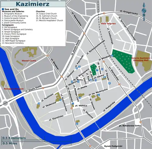 - 🌍 Centre for Jewish Culture (Judaica Foundation), ul. Meiselsa 17, ☏ +48 12 430 64 49. Exhibitions, concerts, seminars and workshops on Jewish culture. There is also a cafe with a roof terrace and a great antiquarian bookshop in the basement.