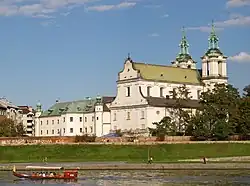 - 🌍 St. Michael's Church (Kościół Św. Michała Archanioła i Św. Stanisława Biskupa i Męczennika w Krakowie (Skałka)), ul. Skałeczna 15. With the monastery of the Paulins, one of the oldest in Poland. The defensive position of the "Church on the Rock" (Skałka) brought settlement already in the 9th century. Bishop St. Stanislaw is said to be killed there by King Boleslaw II in 1079. The garden pond is traditionally believed to have served for pagan sacrifices. Many famous Poles like Jan Długosz, Stanisław Wyspiański, Adam Asnyk, Karol Szymanowski, Józef Ignacy Kraszewski, Jacek Malczewski, and Czesław Miłosz are buried there.
