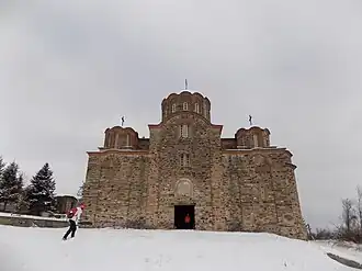 - 🌍 Matejče Monastery (Матеички манастир; Želigovo Monastery), village of Matejče. West of Kumanovo within the Skopska Crna Gora mountain range is this 14th-century monastery. Built atop the foundations of an older church, Serbian King Stefan Dušan began reconstructing the monastery and it was completed by his son Stefan Uroš V in 1357. The monastery's church, dedicated to the Ascension of the Virgin Mary, is in the Byzantine style and has one larger dome and four smaller domes. Its roof was removed by the Ottomans in the 18th century and put atop the Eski Mosque, though it was renovated in the 1920s and 1930s. The village is now primarily Albanian with a small Serb minority. The monastery was occupied by Albanian insurgents during the 2001 conflict who damaged some of the interior frescoes and stole various objects.