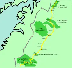 Kungsleden (“The King's Trail”) is a renowned long-distance hiking trail in northern Sweden, stretching approximately 450 kilometres (280 mi) from Abisko in the north to Hemavan in the south. Established by the Swedish Tourist Association (STF) in the early 20th century, it traverses the heart of Swedish Lapland and passes through part of Sápmi, the region inhabited by the Sámi people. The trail runs through the Laponia area, the largest wilderness region in the European Union.
