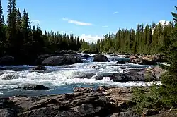 The trail descends steeply to Rävfallsstugan before reaching 🌍 Ammarnäs. Ammarnäs has a grocery store called Ammarnäs Livs. At the bus stop in Ammarnäs there is a free toilet and at the lawn behind the bus stop it is possible to camp for free. Guidecentrum close to the bus, STF Ammarnäs Wärdshus and Ammarnäsgården for eating. Ammarnäsgården also hosts Naturum, with tourist information and nature guides. Fjällvilt sells local reindeer and game products.