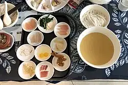 • Er Kuai (饵块, ěrkuài) is a chewy rice cake made from steamed rice, which is pounded, kneaded, and rolled into various shapes. The resulting cakes are used in a number of dishes: thinly-sliced erkuai stir-fried with fragrant spicy hot sauce and pork (chao er kuai), cut into square noodles served with gravy (lu er si) or in soup, or rolled into pancakes which are then wrapped around a youtiao (Chinese donut stick) with a sweet or spicy sauce (er kuai bao you tiao), an addictive street snack.
