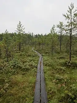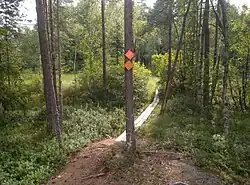 There are duckboards over the bogs and in other especially wet areas, but the trails can be muddy also elsewhere in wet times. In spring, while the snow is melting, some of the trails may be covered with water.