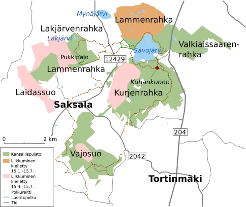 - Tortinmäki–Kurjenpesä around most of the national park (25–30 km?): Tortinmäki, Vajosuo (with lean-to shelter), Takaniitunvuori, Pukkipalo, Lakjärvi (with lean-to shelter), Rantapiha, Savojärvi (via either Lammenrahka or Kuhankuono), Kurjenpesä