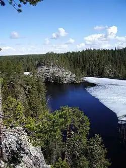 Kuusamo is located in the Koillismaa highlands. It is a watershed, as rivers in the northern part flow north-east to the Arctic Ocean and those in the southern part flow westward to the Baltic Sea. The views consist of steep forested hills (Finnish: vaara) and large, pristine lakes. Bogs and mires are common especially in southern Kuusamo. The river Oulankajoki belongs to the official list of national landscapes of Finland.