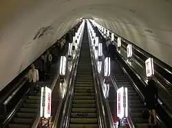The Kyiv metro has some of the deepest stations in the world. The M1 "Arsenalna" is the deepest metro station in the world, at 107 m deep, and the M1 "Universytet" has one of the longest escalators (87 m long). Many stations have two long and intimidating escalators in a row.