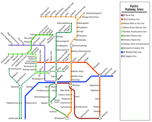 Kyoto is criss-crossed by several train lines, all of which are clearly sign-posted in English. Although the lines are run independently and prices vary slightly between them, transfers can be purchased at most of the ticket machines. The Keihan train line can be useful for traveling in eastern Kyoto, while the two Keifuku (aka Randen) tram lines are an attractive way of traveling in the northwest. Across the street from the northern terminus of the Keihan Line is the Eiden line, which runs to Mount Hiei and Kurama. The Hankyu Line starts at Shijo-Kawaramachi downtown, and connects to the Karasuma Line one stop later at Karasuma. It's useful for reaching Arashiyama and the Katsura Rikyu; it runs all the way to Osaka and Kobe. JR lines run from Kyoto station to the northwest (JR Sagano line), to the southwest (JR Kyoto line) and to the southeast (JR Nara line). There are local and express trains so check if they stop at your station before you get on.
