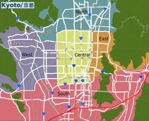 | Central Site of Nijō Castle (a former residence of the Tokugawa shōguns) and the stately grounds of the Imperial Palace. The district's southern end is anchored by the massive glass-and-steel building of the city's main gateway, Kyoto Station. |