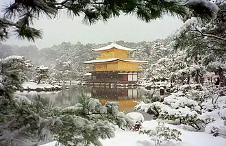 - 🌍 Kinkaku-ji Temple (金閣寺), 1 Kinkakuji-cho, Kita-ku (nearest bus stops: Kinkakuji-michi (routes 12, 59, 101, 102, 204, 205) or Kinkakuji-mae (12 and 59)). Daily 09:00-17:00. The Temple of the Golden Pavilion, formally known as Rokuonji (鹿苑寺), is the most popular tourist attraction in Kyoto. The pavilion was built as a retirement villa for Shogun Ashikaga Yoshimitsu in the late 14th century, and converted into a temple by his son. However, the pavilion was burnt down in 1950, by a young monk who had become obsessed with it. (The story became the basis for Yukio Mishima's novel The Temple of the Golden Pavilion.) The beautiful landscaping and the reflection of the temple on the face of the water make for a striking sight, but keeping the mobs of visitors out of your photos will be a stern test for your framing abilities. Get there early if you can to beat the school groups. Visitors follow a path through the moss garden surrounding the pavilion, before emerging into a square crowded with gift shops. It's only a short walk from Ryōan-ji (below), making for an easy pairing (and study in contrasts). Admission fee is ¥500 for adults and ¥200 for children.