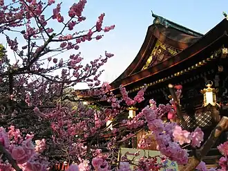 - 🌍 Kitano Tenman-gū (北野天満宮) (nearest bus stop: Kitano Tenmagūmae, routes 10 and 50; just east of Kitano Hakubai-Cho, additional routes 101, 102, 204, 205), ☏ +81 75-461-0005. Normal hours: 09:00-17:00, on the 25th of every month 07:00-21:00. Kitano Tenmangū Shrine was built to appease the soul of Michizane Sugawara, who was a respected member of the Heian Court until he was exiled to Kyushu after falling into disfavor with the Emperor. He died while in exile, and soon after his death, a series of natural disasters mysteriously began plaguing Kyoto. Many suspected that it was the soul of Michizane seeking vengeance, so in order to console his spirit, he was made the God of Learning, and Kitano Tenmangū was built to honor him. Many plum trees were planted within and around the grounds of the shrine, because they were Michizane's favorite flowers, so this shrine is especially beautiful during the plum blossom season from mid-February to mid-March. The shrine is free to enter, the treasure house costs a separate ¥300.