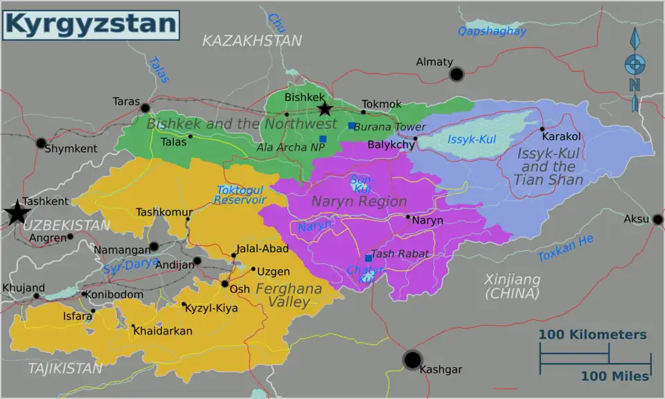 The political situation can deteriorate from time to time with mass protests and even stand-off with weapons by former presidents. It is best to be up to date about the current situation and avoid being near any such tensions, especially in Bishkek. Also, near Tajikistan there are some territorial struggles where parts of Tajikistan lie within the Kyrgys territory (see map), sometimes causing armed conflict between the two countries, especially around those regions (southwest of Osh) — best to also avoid these minor regions.