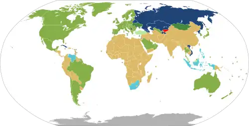 According to the map, all citizens traveling from either Western Sahara or Kosovo will be refused entry into Kyrgyzstan. |