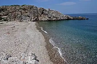 - π Agios Nikolaos (Vlychada beach). The northernmost beach on the island, with a lush canyon in the background, the Peloponnese.