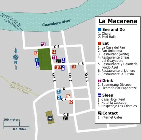 The town is tiny, despite being a "regional center," and you can walk to any local hotel from the airport in less than five minutes. To get out to Serranía de la Macarena and Caño Cristales, you will need to go with a guide (it's mandatory, in no small part because they want to protect the river, but also to keep an eye on you to make sure you don't wander off the beaten path). With your guide, you will cross the river by boat, and then take a jeep, bicycle, motorcycle, or even horse for most of the way to Caño Cristales.