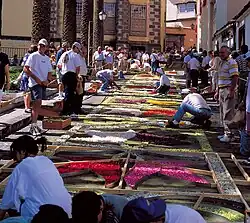 - Festividad del Corpus Christi (Feast of Corpus Christi). 60 days after Easter, usually late May or early June. The Catholic Feast of Corpus Christi has been celebrated in the Canaries since the arrival of the Spanish in the 15th century. As in some other nearby parishes, street processions take place atop elaborate flower 'carpets' (alfombras), laid out the day before by neighbourhood groups, in a tradition practiced since the mid-19th century. Unique to La Orotava is the giant volcanic sand 'carpet' in the Plaza del Ayuntamiento. This tradition dates to 1912, and its creation requires several weeks; visitors can observe the process from the upper steps of the plaza.