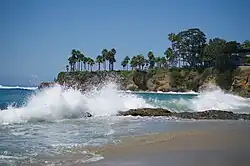 Laguna Beach is a resort-residential community (population about 23,000 in 2018) along the Pacific coast in South Orange County in Southern California. It is known for its extensive artist community, seaside village atmosphere, beautiful beaches, and luxury resort hotels. Fans of the Beach Boys will recall the mention of the city in the song "Surfin' Safari". In warm sunny weather, Laguna Beach can have an overwhelming Mediterranean-island ambiance. Laguna Beach attracts a few million visitors a year.