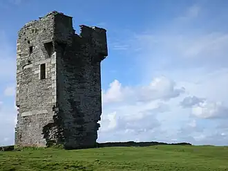 - 🌍 Dough Castle on Lahinch golf course is the stump of a medieval tower. It was the stronghold of the O'Connors, but in 1471 their chieftain was murdered here by his nephews: his burial cairn Leacht Ui Chonchuir being the alternative Irish name for Lahinch. But "Dough" itself is from dumhach - sand dune - and the ruin of the castle is not from attack or Cromwellian demolition but from unstable sand foundations.