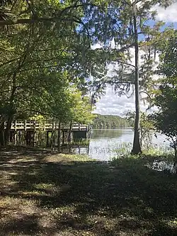 Once you are over the lake, the boardwalk turns about 90 degrees to the left and you will immediately have a few across the lake. On a normal weather day there is only a gentle ripple or small wave effect on the lake. The boardwalk makes a couple curves as it crosses the lake, in the middle going out from the shoreline into the lake. There are a couple places where the boardwalk widens by a foot or two to accommodate wooden bench seating, and roughly half the way across the lake is a gazebo frequented by fishermen. In its entirely the part of the boardwalk above the lake's surface is probably one or two hundred yards. While crossing the lake, tall pines can be seen lining the distant shore marking the boardwalk's re-entrance to the forest; to the right (south) you can see or two small, private piers, which are not accessible from the boardwalk trail.