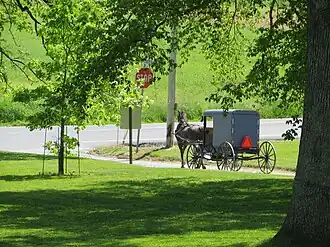 Plan on having a car to get around. You may pass the buggies. If you don't, locals will immediately peg you as a tourist. Keep an eye on oncoming traffic, activate your 4-way or hazard flashers for the duration of the manoeuvre, and pass quickly but safely, with sufficient distance from the horses. Lancastrian drivers are generally very polite, with notable exceptions; they will be courteous as long as you return the favor.