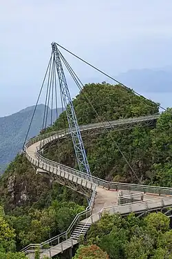 - 🌍 Panorama Langkawi: SkyCab Cable Car Ride & Sky Bridge (in Oriental village, close to Pantai Kok), ☏ +60 4 959 4225, info@panoramalangkawi.com. Daily 9:30AM-7PM. Ride the cable car to the top of the jungle-clad Mt. Machincang and walk across the 700m high Sky Bridge for a spectacular view of the islands and Thailand. During peak times you may have to queue for up to 2 hours. At 125 m long, it is the world’s longest curved suspension bridge. Opened in 2003. The SkyBridge is at the top station of the cable car which can be reached using an elevator/cabin on a track (SkyGlide, RM15 for foreigners) or through a small forest trail (RM5 for foreigners), the trail is only around a 10-minute walk but involves a lot of stairs. The first cable car drop point (the mountain furthest east) can be walked to as well. You follow a path that takes you under the cable cars. Includes a very steep section which is spectacular both going up and coming down. Doesn't operate in bad weather. Also, it doesn't run during the regular maintenance days, check before you go. Officially you are not allowed to take food and drink on the cable car, but they seem not to be checking backpacks (when unlucky and all your water is taken by the security, you can buy one at the top). If they are not operating, or you are really into hiking, you can trek partway up the mountain through the jungle. To do this, from the parking lot at Telagah Tujuh Waterfalls go left just before the road goes really uphill and then turn left again at the water reservoir. The trek is very steep most of the way and in a pretty bad condition because the contractors laying down the piping for cables littered garbage all the way to the top. Only attempt this if you are fit and have good hiking boots. Temperatures at the top of the mountain are 4-5 ⁰C lower than at sea level. Cable car+Skybridge RM43 Adult, RM33 child (Malaysians) RM85 adult, RM65 child for foreigners.