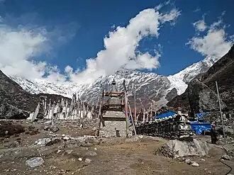- π New Langtang (Langtang). (3430 m) The main village of the trek. Suffered the most from the 2015 earthquake, there are still ongoing reconstruction works. There is a memorial at the entrance of the village. Take the time to make a break (even short) to share the local's hospitality and warmth.