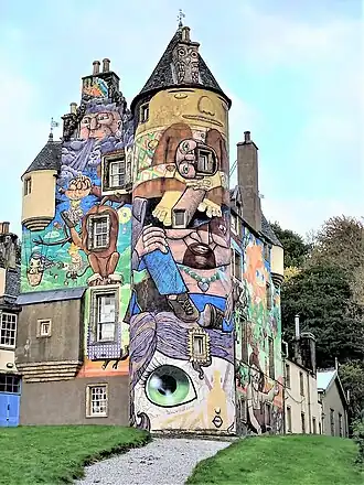 - 🌍 Kelburn Castle: how come Disney never thought of doing up his castle like this? Or Ludwig II at Neuschwanstein? It's a large house 2 miles south of Largs dating to 14th century but prettified into a "chateau" in 1700. The facade needed replacing in 2007 and its owner Lord Glasgow hired Brazilian graffiti artists who gave it a bold, jazzy makeover. Lips were pursed by heritage officialdom, but M'Lud won them over and the graffiti stays. The castle has tours in summer, the grounds are open daily all year (parking £5). The nearby Kel Burn is scenic, rushing down from the hills.