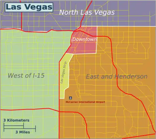| West of I-15 This area of town is largely suburban in character, but still has several attractions within a mile or two of The Strip that many travelers won't want to miss out on. For experiencing some of the nature of the southwestern U.S. Red Rock Canyon on the western rim of the Las Vegas Valley is just a 30 minute drive from The Strip. |