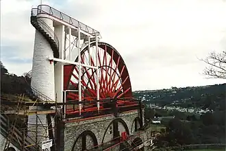 Laxey is a small and very touristy village on the Isle of Man - its Great Wheel is an icon of the island. Laksaa in Manx means salmon, like the modern Scandinavian and German words, and the river descending steeply from Snaefell has a run of salmon. From the 18th century Laxey was a metal-mining village, as it was possible to drill horizontally into the mountainside - such "adits" are technically easier than vertical "shafts", and much easier to drain. The Great Wheel is the best known of several large waterwheels installed to pump out the mines.