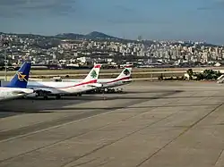 Beirut International Airport (BEY), is 5 km (3 mi) south of the city centre). Middle East Airlines has daily flights from Abidjan, Abu Dhabi, Accra, Amman, Athens, Cairo, Cologne, Copenhagen, Dammam, Doha, Dubai, Frankfurt, Geneva, Istanbul IST, Jeddah, Kano, Kuwait, Lagos, Larnaca, London-Heathrow, Milan-Malpensa, Nice, Paris-Charles de Gaulle, Riyadh and Rome-Fiumicino, Warsaw-Okęcie.