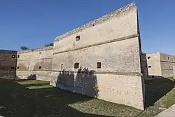Several castles and fortresses are spread over this peripheral land of the ancient Kingdom of Sicily (and later of Naples) since the high Middle Ages, and many of this period structures have been converted into noble palaces over the years. Most of castles were built between 15th and 16th centuries, period of general militarisation of this area and features imposing bastions and internal courtyards. The most majestic ones are: Aragonese castle of Otranto, Acaya Castle (part of a fortified village), Copertino Castle, Gallipoli Angevin Castle, Castle of Charles V in Lecce and De' Monti Castle in Corigliano d'Otranto. Other relevant structures can be admired or visited in Andrano, Acquarica del Capo, Caprarica del Capo, Castro, Felline, Melendugno, Nardò (Acquaviva Castle), Salice Salentino (Monaci Castle), as well as several other minor ones.