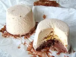 Native of this land is the Lecce cake (pasticciotto leccese), a small pastry made of sweet crust and filled with custard, also if new varieties have developed in latest years, two above all: nutella and pistachio cream. This traditional pastry was invented in the 18th century and it's commonly eaten at breakfast, better if warm. Common to other coastal Italian regions is the cupeta, a crunchy dessert consisting in bars of caramel toasted almonds resembling a nougat. A popular semifreddo dessert is the spumone, a dome-shaped ice-cream flavoured with hazelnut and chocolate, filled with sponge fingers or sponge cake soaked in various liquors. A typical Christmas specialty are the purceddhruzzi (literally meaning piglets) that are almost identical to Neapolitan struffoli.