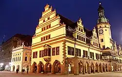 - 🌍 Old Town Hall (Altes Rathaus), Markt 1, ☏ +49 341 9651320. Tu-Su 10:00-18:00, M closed. Built in 1556 in the Renaissance style and remains one of Germany's largest. The position of the tower follows the ancient ideal of "golden mean". Located on the pretty main square of the city, it is a good orientation point. The Old City Hall was built 1556 by Hieronymus Lotter on basements of two Patrician houses. It is a beautiful Renaissance style building, 90 m long with arcades (1906–09), six gables and a tower. In the 18th century the tower was enlarged and it received a Baroque spire. Until 1904 the Old City Hall was home of the city administration. Then it became home of the city museum. Most impressive is the huge Banquetting Hall with Renaissance interior (open fireplaces). Many fine works of medieval religious art: altars, paintings, wood-carved sculptures, etc. Most of them were saved from churches which were deconstructed in Leipzig's surrounding. Very impressive are the rooms with interior from old Patrician houses. Also interesting: the treasure chamber (steep and narrow staircase!). This Renaissance building was erected in just nine months in 1556–57 under the direction of the architect Hieronymus Lotter. The municipal government moved into the New Town Hall in 1909. If you have a bit of luck you are allowed to visit the cellar of the building. Here you find the chamber of torture and the jail. Leipzig's Renaissance City hall contains a museum of city history which possesses the original of the only confirmed painting of Bach produced in his lifetime. It contains interesting information regarding the public executions that used to take place in the market in front of the city hall. The most famous execution was that of Woyzeck, which was made famous by the Büchner play and the opera of Alban Berg. The interior of the Old City Hall (built in 1556) is far more interesting than the outside view. Inside there's an interesting museum covering the history of Leipzig since its beginning in the 12th century. It is one of the most touristy places in the city. €6 adults, €4 concessions.