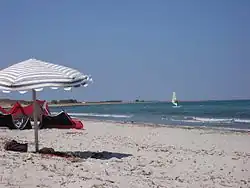 - 🌍 Romaikos beach (Gialos) (a few minutes walk from the center of Myrina). One of the main beaches, belongs to a suburb of Myrina with beautiful neoclassical houses and narrow streets. The beach is not very long, and part has umbrellas and sunbeds. The coast is sandy and the water shallow. At the beach different water sports are offered and other tourist facilities, such as fish taverns and hotels. Going to the nearby hill, one has a beautiful view of Myrina town and the castle.