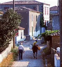 Obvious differences are observed between the style of stone cottages in the rural villages, and the style of the little mansions in the relatively urbanized Myrina. Romeikos Gialos and Androni's renovated 19th-century buildings depict the neo-classic architecture fashion of that period; while Kontias village at the southwest represents a picturesque village of the same time. However, it must be remarked that the building activity, increasing since the past decades, added a lot of modern houses expanding the areas of the villages and Myrina.