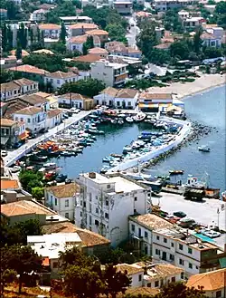 - 🌍 Myrina. Myrina is the capital and the largest city of the island. It is known for its beautiful waterfront and shopping street, neoclassical mansions, and good beaches. Particularly notable is the Venetian fortress on a hill with a special view of the city and the coast; when visibility is clear, you can see Chalkidiki peninsula (Mount Athos) and other surrounding islands (Samothrace, Imvros, etc.). In the castle area, deer roam freely. Myrina is the administrative center of the island, with the ferry port, a hospital, good shopping possibilities, doctors, pharmacies, supermarkets, restaurants, bars, etc. Here you will find everything that you cannot find elsewhere on the island. The tiny museum's collection in Myrina gives more about Lemnos' importance in history. Also, memorials in Myrina and Moudros commemorate many of the battles fought at the region throughout its long history. In the capital Myrina, take a stroll around its cobblestone streets and climb up to the castle, not just for the view but also for the chance to see a few of the island's fallow deer.