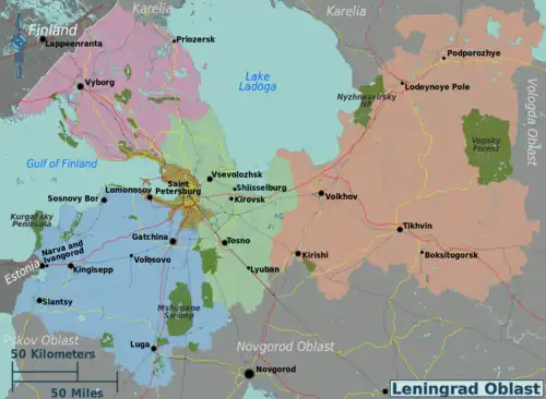 Leningrad Oblast is a region of Northwestern Russia named for the old name of its principal city, Leningrad, now known as Saint Petersburg. It borders Pskov Oblast to the southwest, Estonia and the Gulf of Finland to the west, Finland to the northwest, Karelia and Lake Ladoga to the north, Vologda Oblast to the east, and Novgorod Oblast to the south.
