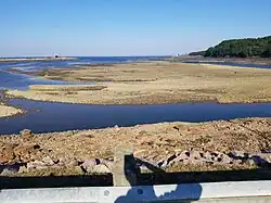 The Highway 138 bridge spans the mouth of the Escoumins river; it was built parallel to the footpath bridge. This path goes around this village bay.