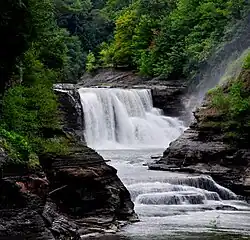The three cascades of the upper Genesee should not be confused with three similar waterfalls farther downstream (to the north) in Rochester. Both locations have a Lower, Middle, and Upper (or High) Falls, and both sets were formed during the same period, but they are more than 50 miles apart.
