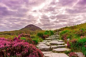 - π Diamond Hill is the one of the "Twelve Bens" that you can't help seeing, as it's so prominent near the highway. Like the others it's quartzite, so "diamond" refers both to its glittering crystal and its etched shape. In Irish it's Binn Ghuaire, meaning "the peak of Guaire" who was a 7th-century king of Connacht. At 442 m (1450 ft) the peak only counts as a "Marilyn" but its easy access and grand views make it popular. Almost too popular, as it had to be closed 2002-05 because of erosion. There's now a stout boardwalk and stone path; the trail starts from the Park visitor centre.