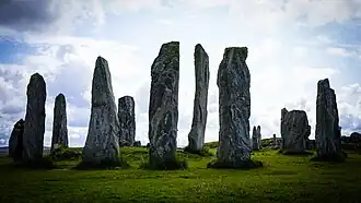 • 🌍 Callanish Standing Stones, Calanais HS2 9DY. Stones 24 hours, visitor centre M-Sa 09:00-16:30. Iconic of Lewis, this is the chief circle ("Callanish I") of an extensive ritual landscape. It was erected some time 2900-2600 BC and is an irregular circle of 13 stones surrounding a monolith, with a cross of avenues or aligned stones radiating. A chambered tomb within the circle was added later: it was only discovered when 19th-century peat-cutting revealed the true height of the stones. They're of local gneiss and have no obvious astronomical alignment. Free. OSM directions target=_blank
