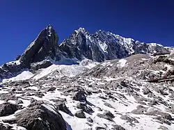 - 🌍 Jade Dragon Snow Mountain (玉龙雪山; Yùlóngxuě Shān) (25 km from Lijiang. Mules can be rented from the nearby Baisha Village or you can take a cable car to the top. Prices vary for the mules depending on what elevation you want to go to. ¥180 to ride to 3800 m plus ¥5 for insurance. ¥300 to 4200 m. ¥350 to 4600 m. If you pay for the lowest elevation you might be able to bargain with the handlers when you reach the end and continue to the higher elevations for a lower price. Passengers over 100 kg might have to pay a surcharge. Tickets for the cable car cost ¥170 round-trip). A mountain massif (also identified as a small mountain range) visible from Lijiang and snow-capped all year round. Its highest peak is Shanzidou (扇子陡; Shānzidǒu) at 5,596 m. The view of the massif from the gardens at the Black Dragon Pool in Lijiang is one of China's finest views. The far side of the mountain forms one side of Tiger Leaping Gorge (虎跳峡; Hǔtiàoxiá).